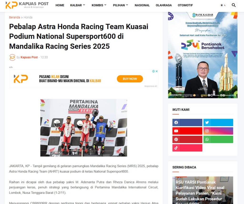 Pebalap Astra Honda Racing Team Kuasai Podium National Supersport600 di Mandalika Racing Series 2025 by Muhammad Arif 4 November 2025 in Silahkan kunjungi https://www.kapuaspost.web.id/2025/11/pebalap-astra-honda-racing-team-kuasai.html. Tags: astra Astra Motor kalbar Astra Motor Pontianak astramotor honda kalbar pontianak sepeda motor You Might Like Regional Public Launching New ADV160 The SUV Pride Grand Launching New PCX 160 Truly Exceptional! Tetap hati-hati ya bro sist berkendara saat hujan.