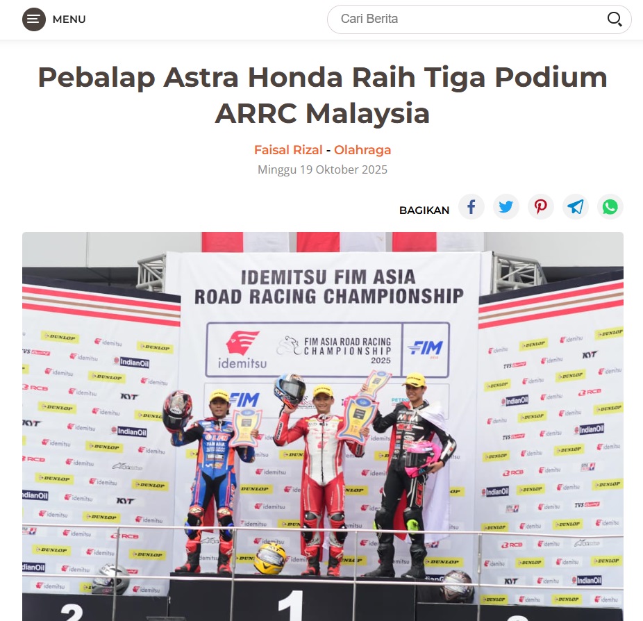 Pebalap Astra Honda Raih Tiga Podium ARRC Malaysia by Dodi Dodi 19 Oktober 2025 in Silahkan kunjungi https://harianberkat.com/2025/10/19/pebalap-astra-honda-raih-tiga-podium-arrc-malaysia/. You Might Like Regional Public Launching New ADV160 The SUV Pride Grand Launching New PCX 160 Truly Exceptional! Tetap hati-hati ya bro sist berkendara saat hujan.