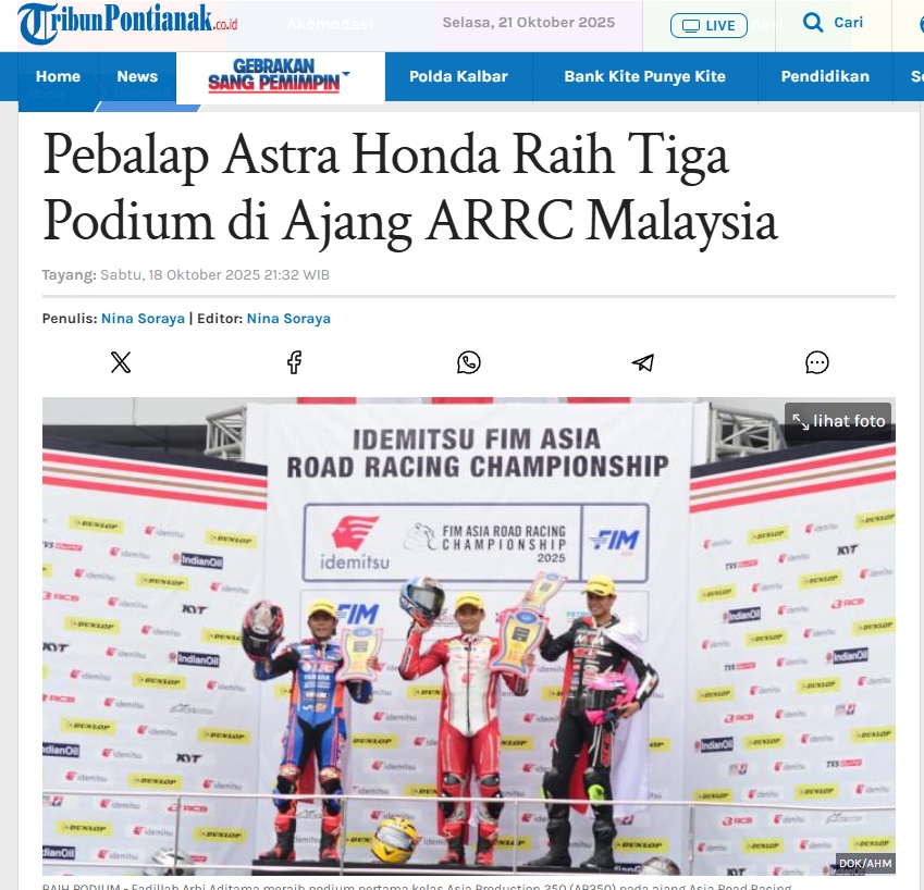 Pebalap Astra Honda Raih Tiga Podium di Ajang ARRC Malaysia by Ishak Ismail 18 Oktober 2025 in Silahkan kunjungi https://pontianak.tribunnews.com/otomotif/1146304/pebalap-astra-honda-raih-tiga-podium-di-ajang-arrc-malaysia. You Might Like Regional Public Launching New ADV160 The SUV Pride Grand Launching New PCX 160 Truly Exceptional! Tetap hati-hati ya bro sist berkendara saat hujan.