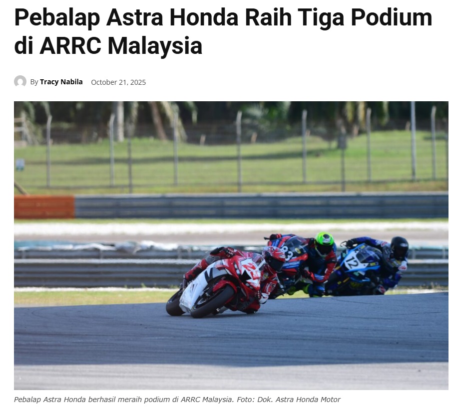 Pebalap Astra Honda Raih Tiga Podium di ARRC Malaysia by Leo Prima 21 Oktober 2025 in Silahkan kunjungi https://pontianaktoday.id/pebalap-astra-honda-raih-tiga-podium-di-arrc-malaysia/. You Might Like Regional Public Launching New ADV160 The SUV Pride Grand Launching New PCX 160 Truly Exceptional! Tetap hati-hati ya bro sist berkendara saat hujan.
