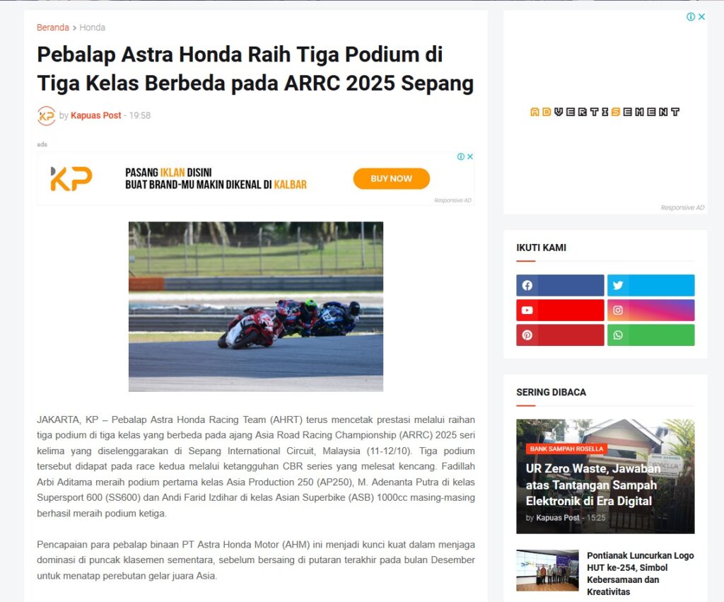 Pebalap Astra Honda Raih Tiga Podium di Tiga Kelas Berbeda pada ARRC 2025 Sepang by Muhammad Arif 19 Oktober 2025 in Silahkan kunjungi https://www.kapuaspost.web.id/2025/10/pebalap-astra-honda-raih-tiga-podium-di.html. Tags: astra Astra Motor kalbar Astra Motor Pontianak astramotor honda kalbar pontianak sepeda motor You Might Like Regional Public Launching New ADV160 The SUV Pride Grand Launching New PCX 160 Truly Exceptional! Tetap hati-hati ya bro sist berkendara saat hujan.