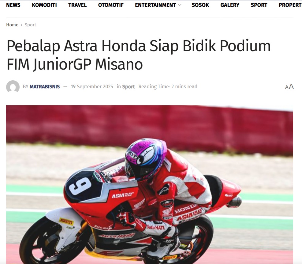 Pebalap Astra Honda Siap Bidik Podium FIM JuniorGP Misano by Sri Yuliantiningsih 19 September 2025 in Silahkan kunjungi https://matrabisnis.id/2025/09/19/pebalap-astra-honda-siap-bidik-podium-fim-juniorgp-misano/. You Might Like Regional Public Launching New ADV160 The SUV Pride Grand Launching New PCX 160 Truly Exceptional! Tetap hati-hati ya bro sist berkendara saat hujan.