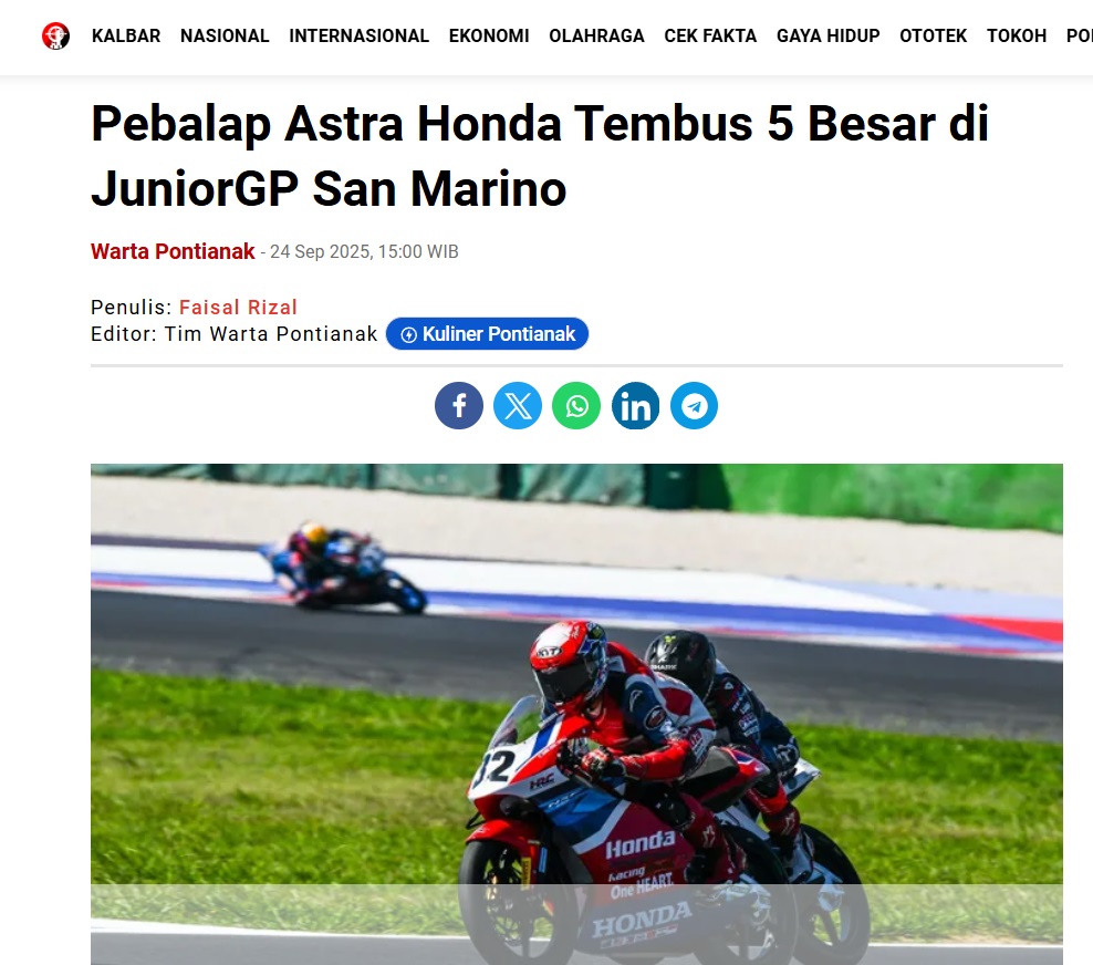 Pebalap Astra Honda Tembus 5 Besar di JuniorGP San Marino by Faisal Rizal 24 September 2025 in Silahkan kunjungi https://wartapontianak.pikiran-rakyat.com/olahraga/pr-1179668478/pebalap-astra-honda-tembus-5-besar-di-juniorgp-san-marino. You Might Like Regional Public Launching New ADV160 The SUV Pride Grand Launching New PCX 160 Truly Exceptional! Tetap hati-hati ya bro sist berkendara saat hujan.