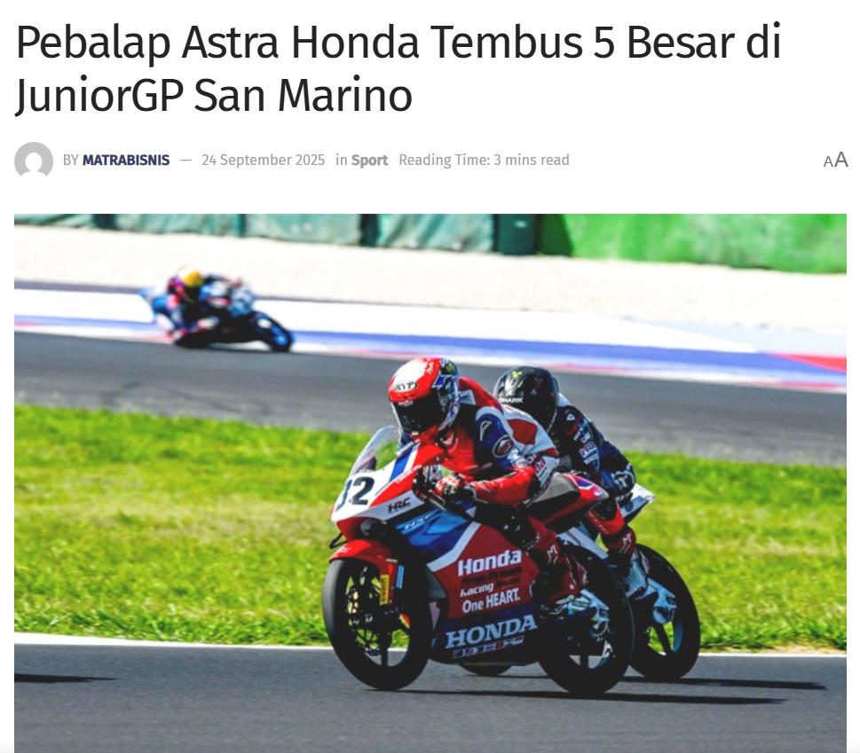 Pebalap Astra Honda Tembus 5 Besar di JuniorGP San Marino by Sri Yuliantiningsih 24 September 2025 in Silahkan kunjungi https://matrabisnis.id/2025/09/24/pebalap-astra-honda-tembus-5-besar-di-juniorgp-san-marino/. You Might Like Regional Public Launching New ADV160 The SUV Pride Grand Launching New PCX 160 Truly Exceptional! Tetap hati-hati ya bro sist berkendara saat hujan.