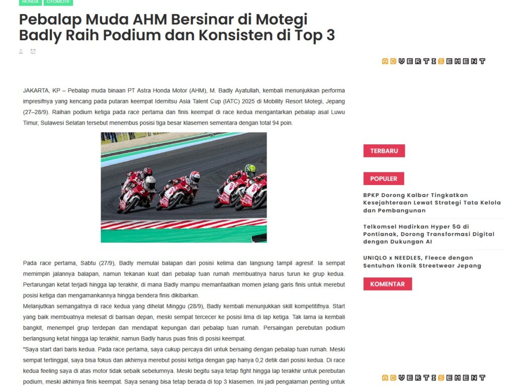 Pebalap Muda AHM Bersinar di Motegi Badly Raih Podium dan Konsisten di Top 3 by Muhammad Arif 1 Oktober 2025 in Silahkan kunjungi https://www.kapuaspost.web.id/2025/10/pebalap-muda-ahm-bersinar-di-motegi.html. Tags: astra Astra Motor kalbar Astra Motor Pontianak astramotor honda kalbar pontianak sepeda motor You Might Like Regional Public Launching New ADV160 The SUV Pride Grand Launching New PCX 160 Truly Exceptional! Tetap hati-hati ya bro sist berkendara saat hujan.