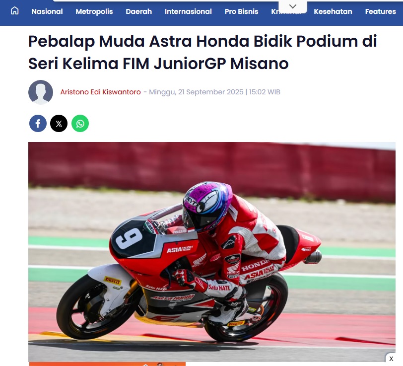 Pebalap Muda Astra Honda Bidik Podium di Seri Kelima FIM JuniorGP Misano by Aristono Edi Kiswantoro 21 September 2025 in Silahkan kunjungi https://pontianakpost.jawapos.com/otomotif/1466601041/pebalap-muda-astra-honda-bidik-podium-di-seri-kelima-fim-juniorgp-misano. You Might Like Regional Public Launching New ADV160 The SUV Pride Grand Launching New PCX 160 Truly Exceptional! Tetap hati-hati ya bro sist berkendara saat hujan.