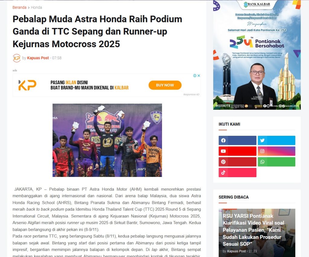 Pebalap Muda Astra Honda Raih Podium Ganda di TTC Sepang dan Runner-up Kejurnas Motocross 2025 by Muhammad Arif 10 November 2025 in Silahkan kunjungi https://www.kapuaspost.web.id/2025/11/pebalap-muda-astra-honda-raih-podium.html. Tags: astra Astra Motor kalbar Astra Motor Pontianak astramotor honda kalbar pontianak sepeda motor You Might Like Regional Public Launching New ADV160 The SUV Pride Grand Launching New PCX 160 Truly Exceptional! Tetap hati-hati ya bro sist berkendara saat hujan.