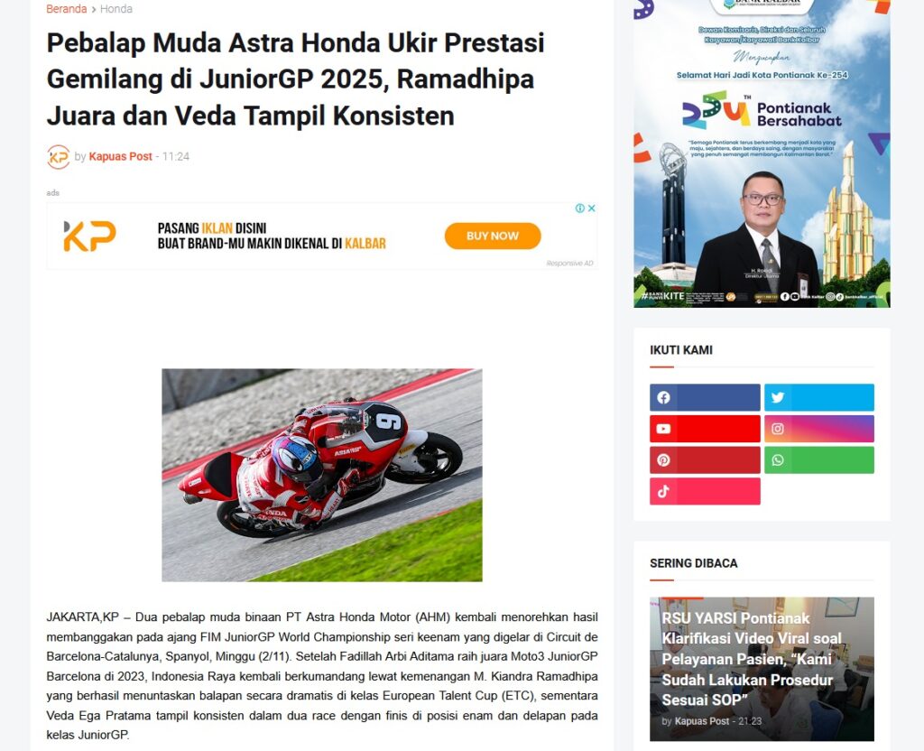 Pebalap Muda Astra Honda Ukir Prestasi Gemilang di JuniorGP 2025, Ramadhipa Juara dan Veda Tampil Konsisten by Muhammad Arif 5 November 2025 in Silahkan kunjungi https://www.kapuaspost.web.id/2025/11/pebalap-muda-astra-honda-ukir-prestasi.html. Tags: astra Astra Motor kalbar Astra Motor Pontianak astramotor honda kalbar pontianak sepeda motor You Might Like Regional Public Launching New ADV160 The SUV Pride Grand Launching New PCX 160 Truly Exceptional! Tetap hati-hati ya bro sist berkendara saat hujan.