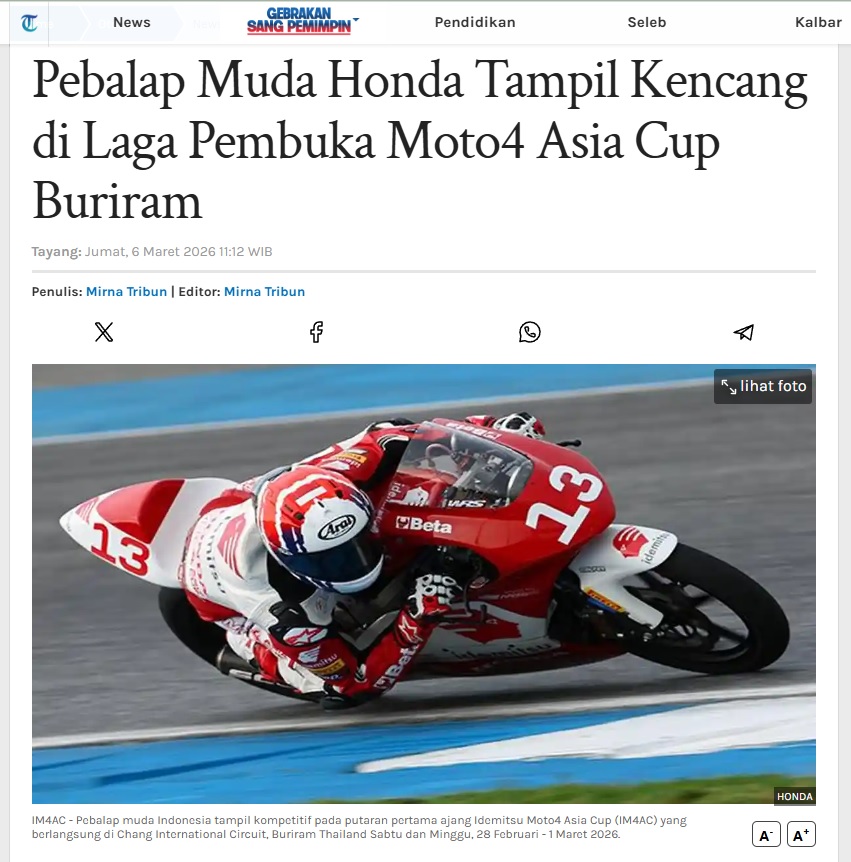 Pebalap Muda Honda Tampil Kencang di Laga Pembuka Moto4 Asia Cup Buriram by Nina Soraya 6 Maret 2026 in Silahkan kunjungi https://pontianak.tribunnews.com/otomotif/1164846/pebalap-muda-honda-tampil-kencang-di-laga-pembuka-moto4-asia-cup-buriram. You Might Like Regional Public Launching New ADV160 The SUV Pride Grand Launching New PCX 160 Truly Exceptional! Tetap hati-hati ya bro sist berkendara saat hujan.
