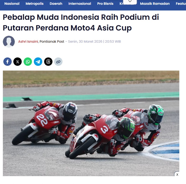 Pebalap Muda Indonesia Raih Podium di Putaran Perdana Moto4 Asia Cup by Aristono Edi Kiswantoro 30 Maret 2026 in Silahkan kunjungi https://pontianakpost.jawapos.com/otomotif/1467339386/pebalap-muda-indonesia-raih-podium-di-putaran-perdana-moto4-asia-cup. You Might Like Regional Public Launching New ADV160 The SUV Pride Grand Launching New PCX 160 Truly Exceptional! Tetap hati-hati ya bro sist berkendara saat hujan.