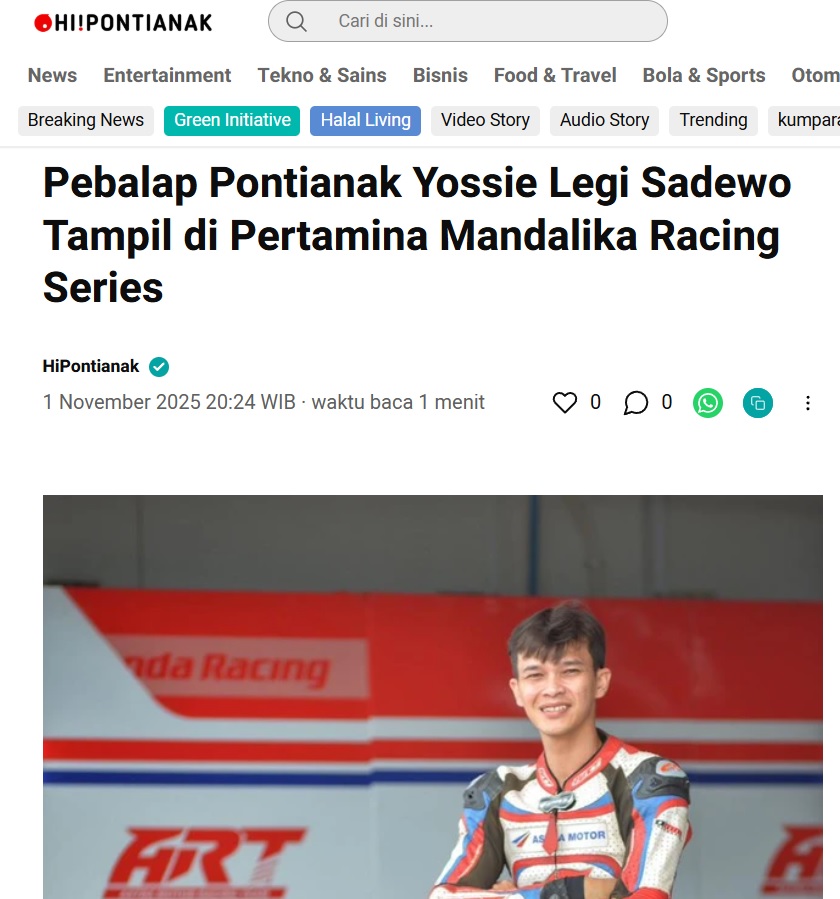 Pebalap Pontianak Yossie Legi Sadewo Tampil di Pertamina Mandalika Racing Series by Leo Prima 1 November 2025 in Silahkan kunjungi https://kumparan.com/hipontianak/269zOuJ73Vm?utm_source=Desktop&utm_medium=copy-to-clipboard&shareID=MdexRwNpgFQu. You Might Like Regional Public Launching New ADV160 The SUV Pride Grand Launching New PCX 160 Truly Exceptional! Tetap hati-hati ya bro sist berkendara saat hujan.
