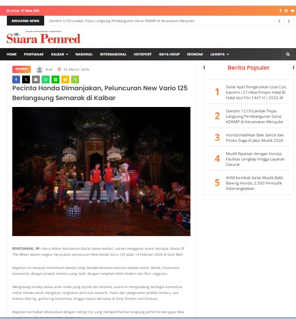 Pecinta Honda Dimanjakan, Peluncuran New Vario 125 Berlangsung Semarak di Kalbar by masmul 25 Maret 2026 in Silahkan kunjungi https://www.suarapemredkalbar.com/read/potret/25032026/pecinta-honda-dimanjakan-peluncuran-new-vario-125-berlangsung-semarak-di-kalbar. You Might Like Regional Public Launching New ADV160 The SUV Pride Grand Launching New PCX 160 Truly Exceptional! Tetap hati-hati ya bro sist berkendara saat hujan.
