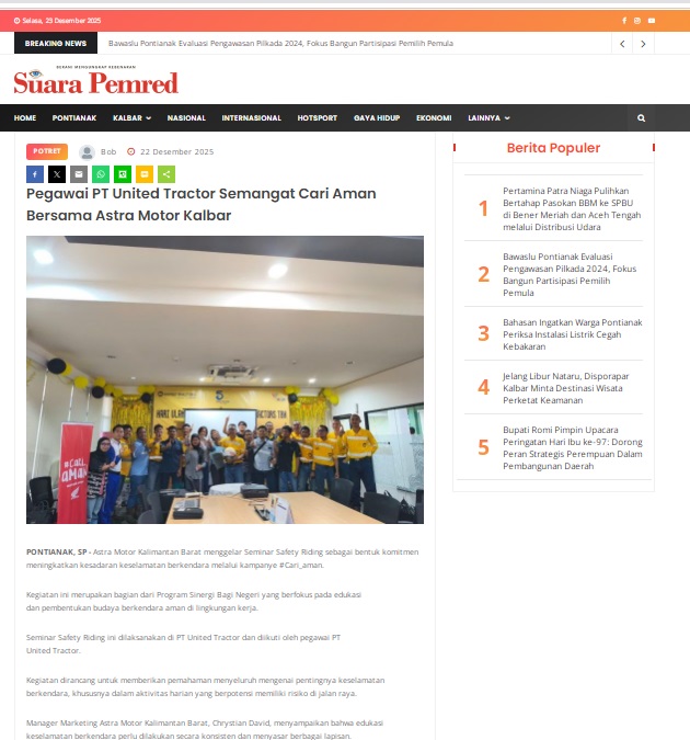 Pegawai PT United Tractor Semangat Cari Aman Bersama Astra Motor Kalbar by masmul 22 Desember 2025 in Silahkan kunjungi https://www.suarapemredkalbar.com/read/potret/22122025/pegawai-pt-united-tractor-semangat-cari-aman-bersama-astra-motor-kalbar. You Might Like Regional Public Launching New ADV160 The SUV Pride Grand Launching New PCX 160 Truly Exceptional! Tetap hati-hati ya bro sist berkendara saat hujan.