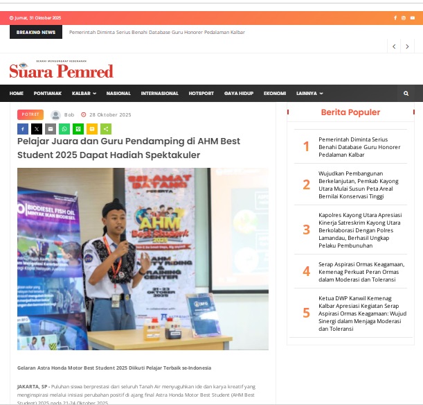 Pelajar Juara dan Guru Pendamping di AHM Best Student 2025 Dapat Hadiah Spektakuler by masmul 28 Oktober 2025 in Silahkan kunjungi https://www.suarapemredkalbar.com/read/potret/28102025/pelajar-juara-dan-guru-pendamping-di-ahm-best-student-2025-dapat-hadiah-spektakuler. You Might Like Regional Public Launching New ADV160 The SUV Pride Grand Launching New PCX 160 Truly Exceptional! Tetap hati-hati ya bro sist berkendara saat hujan.