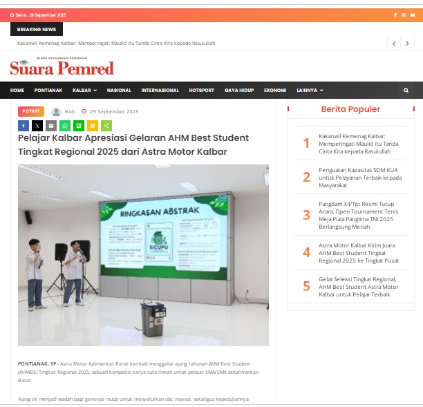 Pelajar Kalbar Apresiasi Gelaran AHM Best Student Tingkat Regional 2025 dari Astra Motor Kalbar by masmul 29 September 2025 in Silahkan kunjungi https://www.suarapemredkalbar.com/read/potret/29092025/pelajar-kalbar-apresiasi-gelaran-ahm-best-student-tingkat-regional-2025-dari-astra-motor-kalbar. You Might Like Regional Public Launching New ADV160 The SUV Pride Grand Launching New PCX 160 Truly Exceptional! Tetap hati-hati ya bro sist berkendara saat hujan.