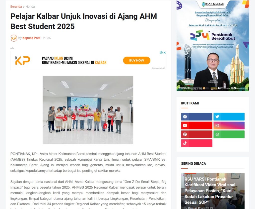 Pelajar Kalbar Unjuk Inovasi di Ajang AHM Best Student 2025 by Muhammad Arif 14 Oktober 2025 in Silahkan kunjungi https://www.kapuaspost.web.id/2025/10/pelajar-kalbar-unjuk-inovasi-di-ajang.html. Tags: astra Astra Motor kalbar Astra Motor Pontianak astramotor honda kalbar pontianak sepeda motor You Might Like Regional Public Launching New ADV160 The SUV Pride Grand Launching New PCX 160 Truly Exceptional! Tetap hati-hati ya bro sist berkendara saat hujan.