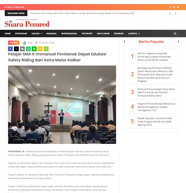 Pelajar SMA K Immanuel Pontianak Dapat Edukasi Safety Riding dari Astra Motor Kalbar by masmul 5 Maret 2026 in Silahkan kunjungi https://www.suarapemredkalbar.com/read/potret/05032026/pelajar-sma-k-immanuel-pontianak-dapat-edukasi-safety-riding-dari-astra-motor-kalbar. You Might Like Regional Public Launching New ADV160 The SUV Pride Grand Launching New PCX 160 Truly Exceptional! Tetap hati-hati ya bro sist berkendara saat hujan.