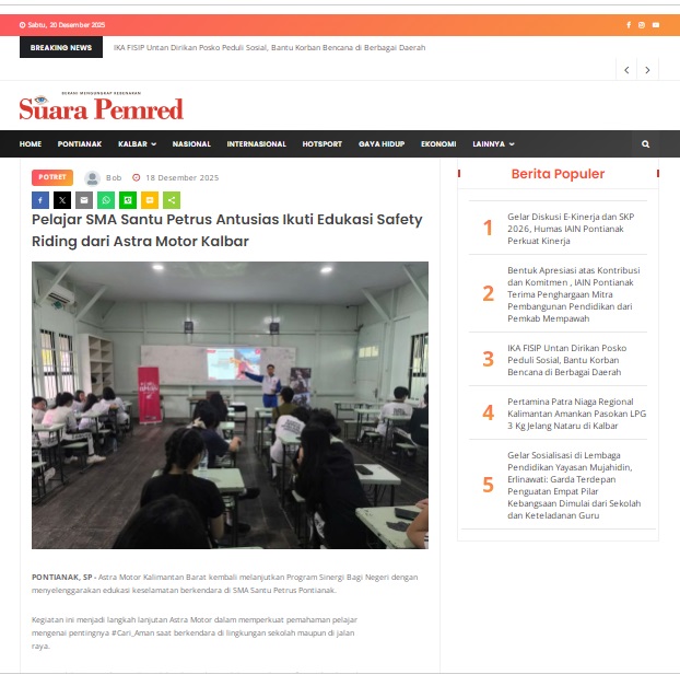 Pelajar SMA Santu Petrus Antusias Ikuti Edukasi Safety Riding dari Astra Motor Kalbar by masmul 18 Desember 2025 in Silahkan kunjungi https://www.suarapemredkalbar.com/read/potret/18122025/pelajar-sma-santu-petrus-antusias-ikuti-edukasi-safety-riding-dari-astra-motor-kalbar. You Might Like Regional Public Launching New ADV160 The SUV Pride Grand Launching New PCX 160 Truly Exceptional! Tetap hati-hati ya bro sist berkendara saat hujan.