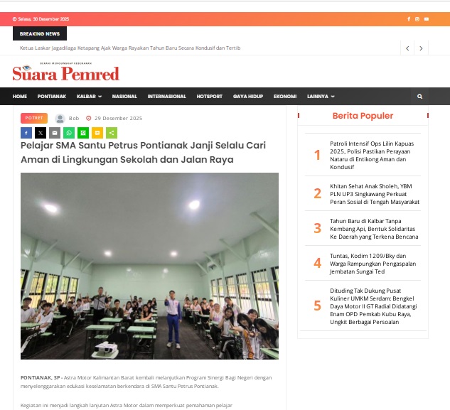Pelajar SMA Santu Petrus Pontianak Janji Selalu Cari Aman di Lingkungan Sekolah dan Jalan Raya by masmul 29 Desember 2025 in Silahkan kunjungi https://www.suarapemredkalbar.com/read/potret/29122025/pelajar-sma-santu-petrus-pontianak-janji-selalu-cari-aman-di-lingkungan-sekolah-dan-jalan-raya. You Might Like Regional Public Launching New ADV160 The SUV Pride Grand Launching New PCX 160 Truly Exceptional! Tetap hati-hati ya bro sist berkendara saat hujan.