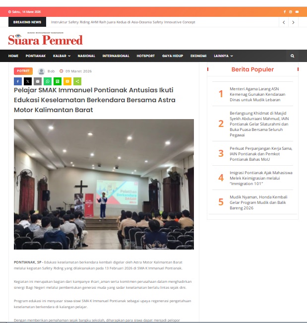 Pelajar SMAK Immanuel Pontianak Antusias Ikuti Edukasi Keselamatan Berkendara Bersama Astra Motor Kalimantan Barat by masmul 9 Maret 2026 in Silahkan kunjungi https://www.suarapemredkalbar.com/read/potret/09032026/pelajar-smak-immanuel-pontianak-antusias-ikuti-edukasi-keselamatan-berkendara-bersama-astra-motor-kalimantan-barat. You Might Like Regional Public Launching New ADV160 The SUV Pride Grand Launching New PCX 160 Truly Exceptional! Tetap hati-hati ya bro sist berkendara saat hujan.