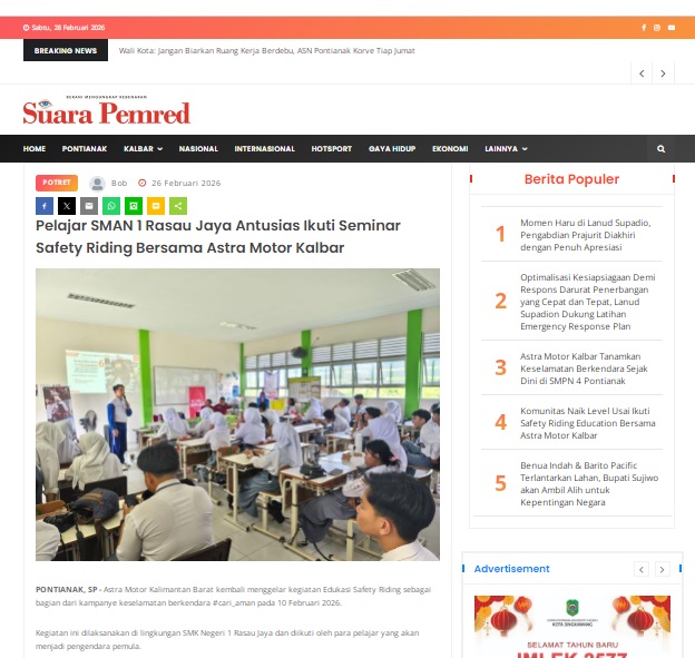 Pelajar SMAN 1 Rasau Jaya Antusias Ikuti Seminar Safety Riding Bersama Astra Motor Kalbar by masmul 26 Februari 2026 in Silahkan kunjungi https://www.suarapemredkalbar.com/read/potret/26022026/pelajar-sman-1-rasau-jaya-antusias-ikuti-seminar-safety-riding-bersama-astra-motor-kalbar. You Might Like Regional Public Launching New ADV160 The SUV Pride Grand Launching New PCX 160 Truly Exceptional! Tetap hati-hati ya bro sist berkendara saat hujan.