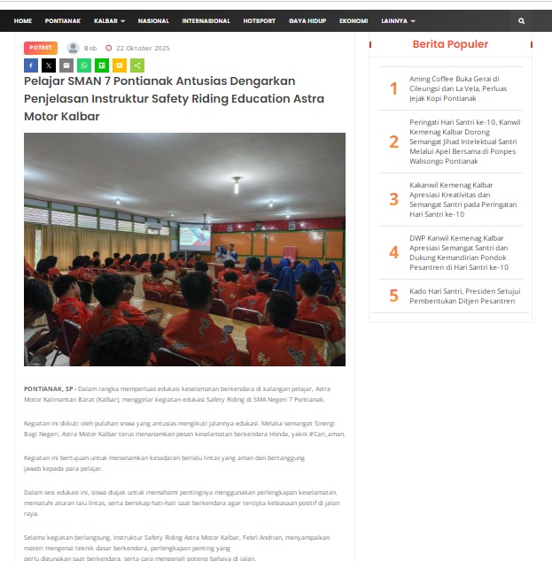 Pelajar SMAN 7 Pontianak Antusias Dengarkan Penjelasan Instruktur Safety Riding Education Astra Motor Kalbar by masmul 22 Oktober 2025 in Silahkan kunjungi https://www.suarapemredkalbar.com/read/potret/22102025/pelajar-sman-7-pontianak-antusias-dengarkan-penjelasan-instruktur-safety-riding-education-astra-motor-kalbar. You Might Like Regional Public Launching New ADV160 The SUV Pride Grand Launching New PCX 160 Truly Exceptional! Tetap hati-hati ya bro sist berkendara saat hujan.