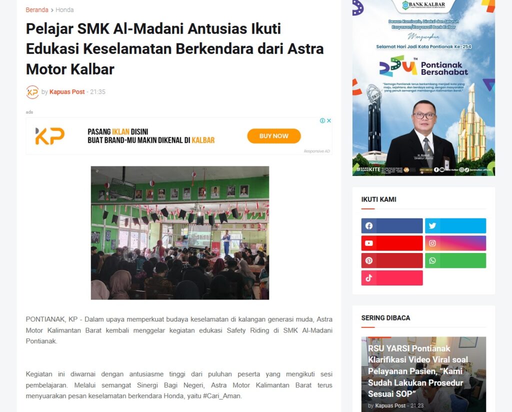 Pelajar SMK Al-Madani Antusias Ikuti Edukasi Keselamatan Berkendara dari Astra Motor Kalbar by Muhammad Arif 28 Oktober 2025 in Silahkan kunjungi https://www.kapuaspost.web.id/2025/10/pelajar-smk-al-madani-antusias-ikuti.html. Tags: astra Astra Motor kalbar Astra Motor Pontianak astramotor honda kalbar pontianak sepeda motor You Might Like Regional Public Launching New ADV160 The SUV Pride Grand Launching New PCX 160 Truly Exceptional! Tetap hati-hati ya bro sist berkendara saat hujan.