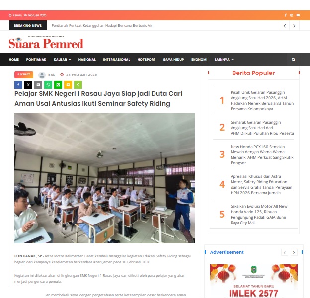 Pelajar SMK Negeri 1 Rasau Jaya Siap jadi Duta Cari Aman Usai Antusias Ikuti Seminar Safety Riding by masmul 23 Februari 2026 in Silahkan kunjungi https://www.suarapemredkalbar.com/read/potret/23022026/pelajar-smk-negeri-1-rasau-jaya-siap-jadi-duta-cari-aman-usai-antusias-ikuti-seminar-safety-riding. You Might Like Regional Public Launching New ADV160 The SUV Pride Grand Launching New PCX 160 Truly Exceptional! Tetap hati-hati ya bro sist berkendara saat hujan.
