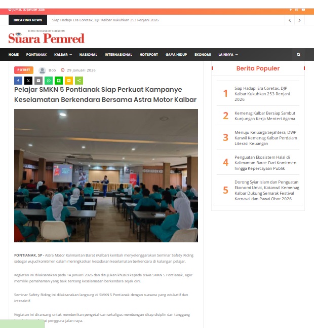 Pelajar SMKN 5 Pontianak Siap Perkuat Kampanye Keselamatan Berkendara Bersama Astra Motor Kalbar by masmul 29 Januari 2026 in Silahkan kunjungi https://www.suarapemredkalbar.com/read/potret/29012026/pelajar-smkn-5-pontianak-siap-perkuat-kampanye-keselamatan-berkendara-bersama-astra-motor-kalbar. You Might Like Regional Public Launching New ADV160 The SUV Pride Grand Launching New PCX 160 Truly Exceptional! Tetap hati-hati ya bro sist berkendara saat hujan.