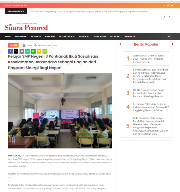 Pelajar SMP Negeri 13 Pontianak Ikuti Sosialisasi Keselamatan Berkendara sebagai Bagian dari Program Sinergi Bagi Negeri by masmul 16 Desember 2025 in Silahkan kunjungi https://www.suarapemredkalbar.com/read/potret/16122025/pelajar-smp-negeri-13-pontianak-ikuti-sosialisasi-keselamatan-berkendara-sebagai-bagian-dari-program-sinergi-bagi-negeri. You Might Like Regional Public Launching New ADV160 The SUV Pride Grand Launching New PCX 160 Truly Exceptional! Tetap hati-hati ya bro sist berkendara saat hujan.