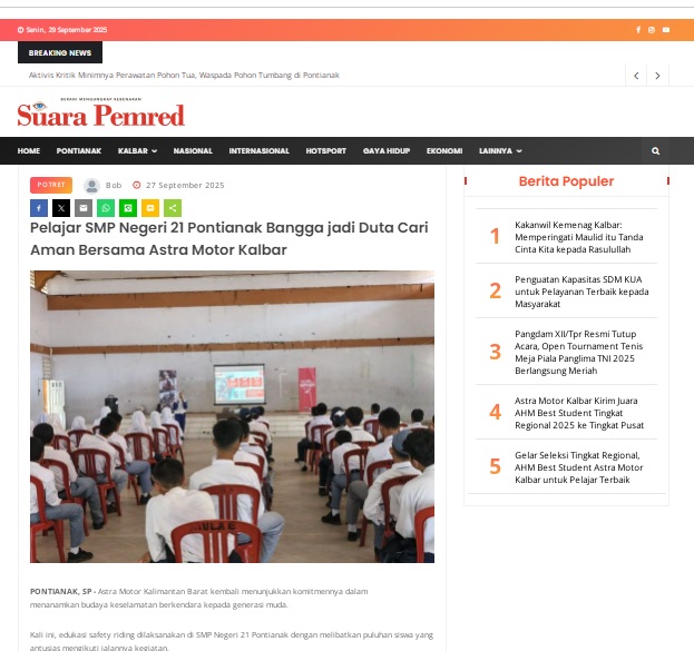 Pelajar SMP Negeri 21 Pontianak Bangga jadi Duta Cari Aman Bersama Astra Motor Kalbar by masmul 27 September 2025 in Silahkan kunjungi https://www.suarapemredkalbar.com/read/potret/27092025/pelajar-smp-negeri-21-pontianak-bangga-jadi-duta-cari-aman-bersama-astra-motor-kalbar. You Might Like Regional Public Launching New ADV160 The SUV Pride Grand Launching New PCX 160 Truly Exceptional! Tetap hati-hati ya bro sist berkendara saat hujan.