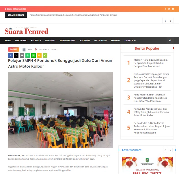 Pelajar SMPN 4 Pontianak Bangga jadi Duta Cari Aman Astra Motor Kalbar by masmul 26 Februari 2026 in Silahkan kunjungi https://www.suarapemredkalbar.com/read/potret/26022026/pelajar-smpn-4-pontianak-bangga-jadi-duta-cari-aman-astra-motor-kalbar. You Might Like Regional Public Launching New ADV160 The SUV Pride Grand Launching New PCX 160 Truly Exceptional! Tetap hati-hati ya bro sist berkendara saat hujan.