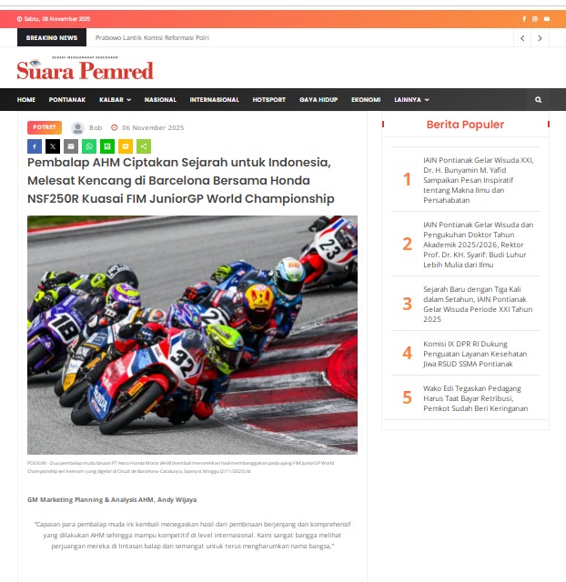 Pembalap AHM Ciptakan Sejarah untuk Indonesia, Melesat Kencang di Barcelona Bersama Honda NSF250R Kuasai FIM JuniorGP World Championship by masmul 6 November 2025 in Silahkan kunjungi https://www.suarapemredkalbar.com/read/potret/06112025/pembalap-ahm-ciptakan-sejarah-untuk-indonesia-melesat-kencang-di-barcelona-bersama-honda-nsf250r-kuasai-fim-juniorgp-world-championship. You Might Like Regional Public Launching New ADV160 The SUV Pride Grand Launching New PCX 160 Truly Exceptional! Tetap hati-hati ya bro sist berkendara saat hujan.