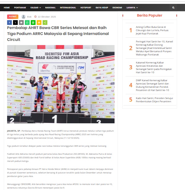 Pembalap AHRT Bawa CBR Series Melesat dan Raih Tiga Podium ARRC Malaysia di Sepang International Circuit by masmul 22 Oktober 2025 in Silahkan kunjungi https://www.suarapemredkalbar.com/read/potret/22102025/pembalap-ahrt-bawa-cbr-series-melesat-dan-raih-tiga-podium-arrc-malaysia-di-sepang-international-circuit-1. You Might Like Regional Public Launching New ADV160 The SUV Pride Grand Launching New PCX 160 Truly Exceptional! Tetap hati-hati ya bro sist berkendara saat hujan.