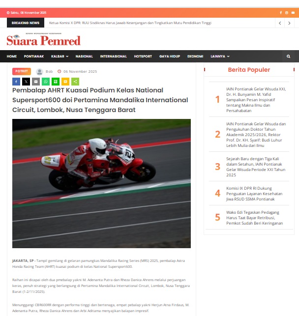 Pembalap AHRT Kuasai Podium Kelas National Supersport600 doi Pertamina Mandalika International Circuit, Lombok, Nusa Tenggara Barat by masmul 6 November 2025 in Silahkan kunjungi https://www.suarapemredkalbar.com/read/potret/06112025/pembalap-ahrt-kuasai-podium-kelas-national-supersport600-doi-pertamina-mandalika-international-circuit-lombok-nusa-tenggara-barat. You Might Like Regional Public Launching New ADV160 The SUV Pride Grand Launching New PCX 160 Truly Exceptional! Tetap hati-hati ya bro sist berkendara saat hujan.
