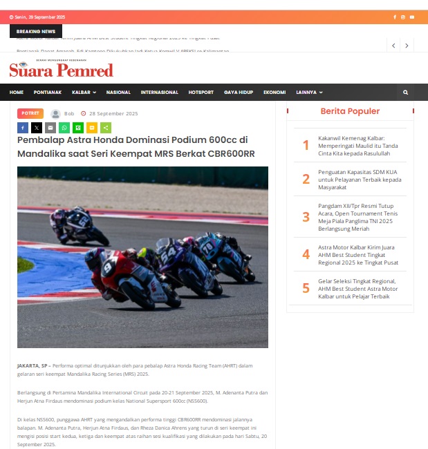 Pembalap Astra Honda Dominasi Podium 600cc di Mandalika saat Seri Keempat MRS Berkat CBR600RR by masmul 28 September 2025 in Silahkan kunjungi https://www.suarapemredkalbar.com/read/potret/28092025/pembalap-astra-honda-dominasi-podium-600cc-di-mandalika-saat-seri-keempat-mrs-berkat-cbr600rr. You Might Like Regional Public Launching New ADV160 The SUV Pride Grand Launching New PCX 160 Truly Exceptional! Tetap hati-hati ya bro sist berkendara saat hujan.