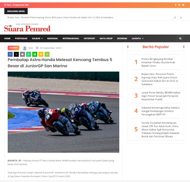 Pembalap Astra Honda Melesat Kencang Tembus 5 Besar di JuniorGP San Marino by masmul 23 September 2025 in Silahkan kunjungi https://www.suarapemredkalbar.com/read/potret/23092025/pembalap-astra-honda-melesat-kencang-tembus-5-besar-di-juniorgp-san-marino. You Might Like Regional Public Launching New ADV160 The SUV Pride Grand Launching New PCX 160 Truly Exceptional! Tetap hati-hati ya bro sist berkendara saat hujan.