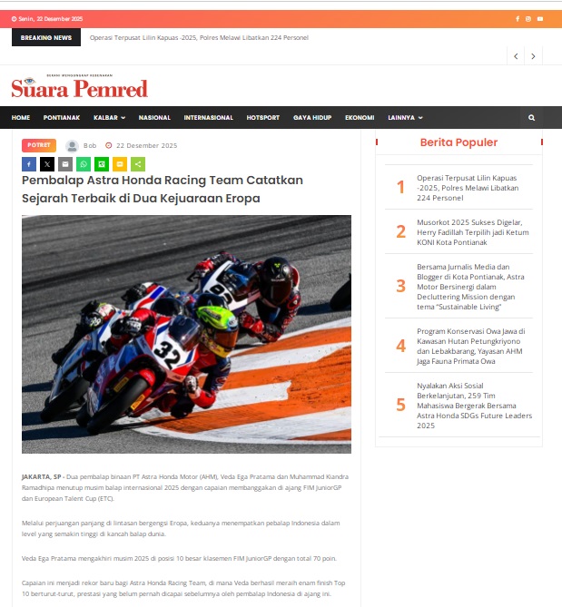 Pembalap Astra Honda Racing Team Catatkan Sejarah Terbaik di Dua Kejuaraan Eropa by masmul 22 Desember 2025 in Silahkan kunjungi https://www.suarapemredkalbar.com/read/potret/22122025/pembalap-astra-honda-racing-team-catatkan-sejarah-terbaik-di-dua-kejuaraan-eropa. You Might Like Regional Public Launching New ADV160 The SUV Pride Grand Launching New PCX 160 Truly Exceptional! Tetap hati-hati ya bro sist berkendara saat hujan.