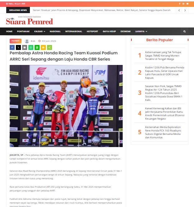 Pembalap Astra Honda Racing Team Kuasai Podium ARRC Seri Sepang dengan Laju Honda CBR Series by masmul 3 Juni 2025 in Silahkan kunjungi https://www.suarapemredkalbar.com/read/potret/03062025/pembalap-astra-honda-racing-team-kuasai-podium-arrc-seri-sepang-dengan-laju-honda-cbr-series. You Might Like Regional Public Launching New ADV160 The SUV Pride Grand Launching New PCX 160 Truly Exceptional! Tetap hati-hati ya bro sist berkendara saat hujan.