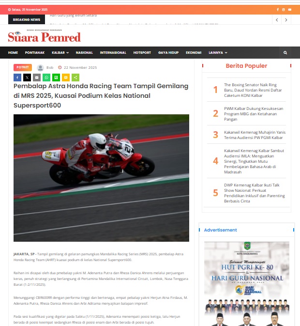 Pembalap Astra Honda Racing Team Tampil Gemilang di MRS 2025, Kuasai Podium Kelas National Supersport600 by masmul 22 November 2025 in Silahkan kunjungi https://www.suarapemredkalbar.com/read/potret/22112025/pembalap-astra-honda-racing-team-tampil-gemilang-di-mrs-2025-kuasai-podium-kelas-national-supersport600. You Might Like Regional Public Launching New ADV160 The SUV Pride Grand Launching New PCX 160 Truly Exceptional! Tetap hati-hati ya bro sist berkendara saat hujan.