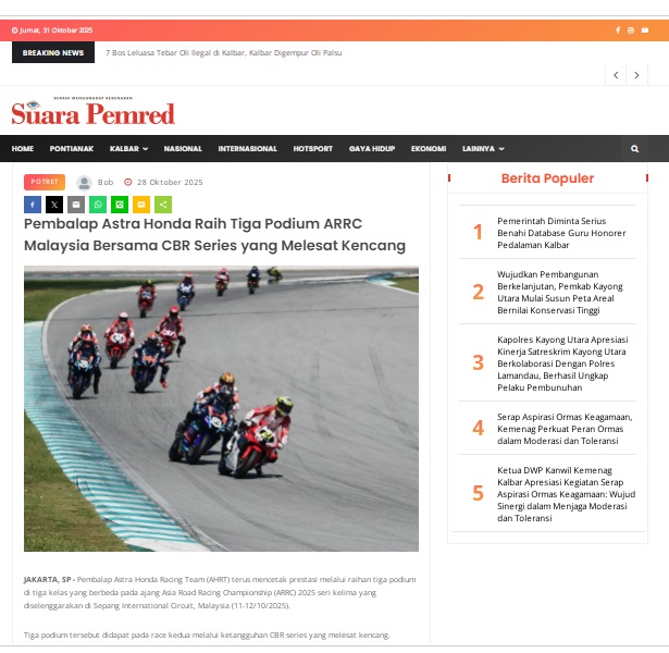 Pembalap Astra Honda Raih Tiga Podium ARRC Malaysia Bersama CBR Series yang Melesat Kencang by masmul 28 Oktober 2025 in Silahkan kunjungi https://www.suarapemredkalbar.com/read/potret/28102025/pembalap-astra-honda-raih-tiga-podium-arrc-malaysia-bersama-cbr-series-yang-melesat-kencang. You Might Like Regional Public Launching New ADV160 The SUV Pride Grand Launching New PCX 160 Truly Exceptional! Tetap hati-hati ya bro sist berkendara saat hujan.