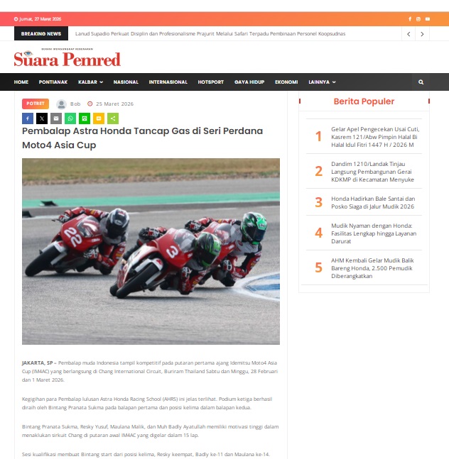 Pembalap Astra Honda Tancap Gas di Seri Perdana Moto4 Asia Cup by masmul 25 Maret 2026 in Silahkan kunjungi https://www.suarapemredkalbar.com/read/potret/25032026/pembalap-astra-honda-tancap-gas-di-seri-perdana-moto4-asia-cup. You Might Like Regional Public Launching New ADV160 The SUV Pride Grand Launching New PCX 160 Truly Exceptional! Tetap hati-hati ya bro sist berkendara saat hujan.