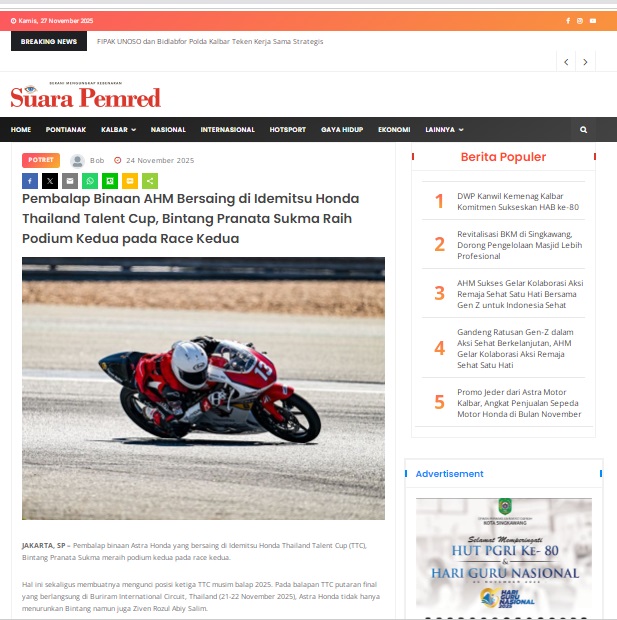 Pembalap Binaan AHM Bersaing di Idemitsu Honda Thailand Talent Cup, Bintang Pranata Sukma Raih Podium Kedua pada Race Kedua by masmul 24 November 2025 in Silahkan kunjungi https://www.suarapemredkalbar.com/read/potret/24112025/pembalap-binaan-ahm-bersaing-di-idemitsu-honda-thailand-talent-cup-bintang-pranata-sukma-raih-podium-kedua-pada-race-kedua. You Might Like Regional Public Launching New ADV160 The SUV Pride Grand Launching New PCX 160 Truly Exceptional! Tetap hati-hati ya bro sist berkendara saat hujan.