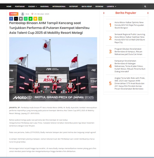 Pembalap Binaan AHM Tampil Kencang saat Tunjukkan Performa di Putaran Keempat Idemitsu Asia Talent Cup 2025 di Mobility Resort Motegi by masmul 25 Oktober 2025 in Silahkan kunjungi https://www.suarapemredkalbar.com/read/potret/25102025/pembalap-binaan-ahm-tampil-kencang-saat-tunjukkan-performa-di-putaran-keempat-idemitsu-asia-talent-cup-2025-di-mobility-resort-motegi. You Might Like Regional Public Launching New ADV160 The SUV Pride Grand Launching New PCX 160 Truly Exceptional! Tetap hati-hati ya bro sist berkendara saat hujan.