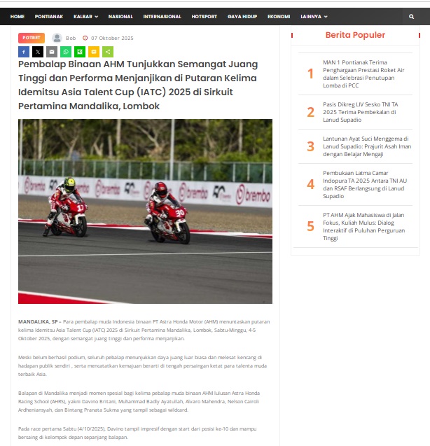 Pembalap Binaan AHM Tunjukkan Semangat Juang Tinggi dan Performa Menjanjikan di Putaran Kelima Idemitsu Asia Talent Cup (IATC) 2025 di Sirkuit Pertamina Mandalika, Lombok Photo of Pembalap Binaan AHM Tunjukkan Semangat Juang Tinggi dan Performa Menjanjikan di Putaran Kelima Idemitsu Asia Talent Cup (IATC) 2025 di Sirkuit Pertamina Mandalika, Lombok