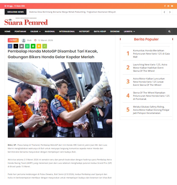 Pembalap Honda MotoGP Disambut Tari Kecak, Gabungan Bikers Honda Gelar Kopdar Meriah by masmul 12 Maret 2026 in Silahkan kunjungi https://www.suarapemredkalbar.com/read/potret/12032026/pembalap-honda-motogp-disambut-tari-kecak-gabungan-bikers-honda-gelar-kopdar-meriah. You Might Like Regional Public Launching New ADV160 The SUV Pride Grand Launching New PCX 160 Truly Exceptional! Tetap hati-hati ya bro sist berkendara saat hujan.