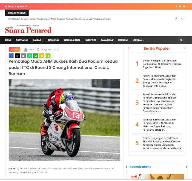 Pembalap Muda AHM Sukses Raih Dua Podium Kedua pada ITTC di Round 3 Chang International Circuit, Buriram by masmul 26 Agustus 2025 in Silahkan kunjungi https://www.suarapemredkalbar.com/read/potret/26082025/pembalap-muda-ahm-sukses-raih-dua-podium-kedua-pada-ittc-di-round-3-chang-international-circuit-buriram. You Might Like Regional Public Launching New ADV160 The SUV Pride Grand Launching New PCX 160 Truly Exceptional! Tetap hati-hati ya bro sist berkendara saat hujan.