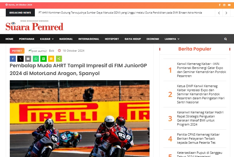 Pembalap Muda AHRT Tampil Impresif di FIM JuniorGP 2024 di MotorLand Aragon, Spanyol by masmul 18 Oktober 2024 in Silahkan kunjungi https://www.suarapemredkalbar.com/read/potret/18102024/pembalap-muda-ahrt-tampil-impresif-di-fim-juniorgp-2024-di-motorland-aragon-spanyol. You Might Like Regional Public Launching New ADV160 The SUV Pride Grand Launching New PCX 160 Truly Exceptional! Tetap hati-hati ya bro sist berkendara saat hujan.