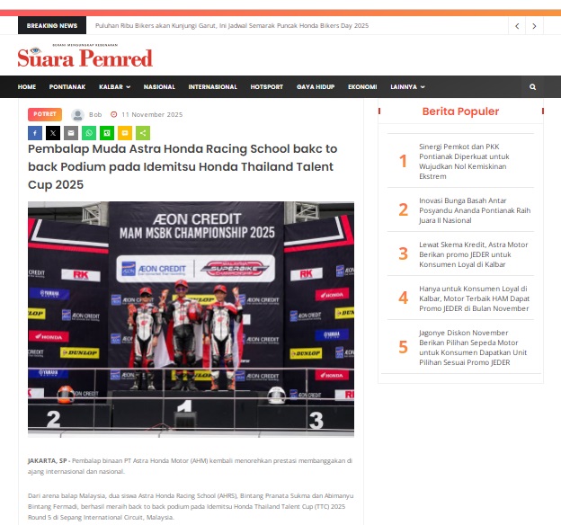 Pembalap Muda Astra Honda Racing School bakc to back Podium pada Idemitsu Honda Thailand Talent Cup 2025 by masmul 11 November 2025 in Silahkan kunjungi https://www.suarapemredkalbar.com/read/potret/11112025/pembalap-muda-astra-honda-racing-school-bakc-to-back-podium-pada-idemitsu-honda-thailand-talent-cup-2025. You Might Like Regional Public Launching New ADV160 The SUV Pride Grand Launching New PCX 160 Truly Exceptional! Tetap hati-hati ya bro sist berkendara saat hujan.