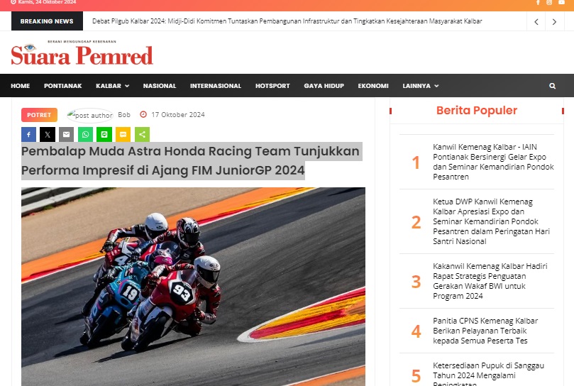 Pembalap Muda Astra Honda Racing Team Tunjukkan Performa Impresif di Ajang FIM JuniorGP 2024 by masmul 16 Oktober 2024 in Silahkan kunjungi https://www.suarapemredkalbar.com/read/potret/17102024/pembalap-muda-astra-honda-racing-team-tunjukkan-performa-impresif-di-ajang-fim-juniorgp-2024. You Might Like Regional Public Launching New ADV160 The SUV Pride Grand Launching New PCX 160 Truly Exceptional! Tetap hati-hati ya bro sist berkendara saat hujan.